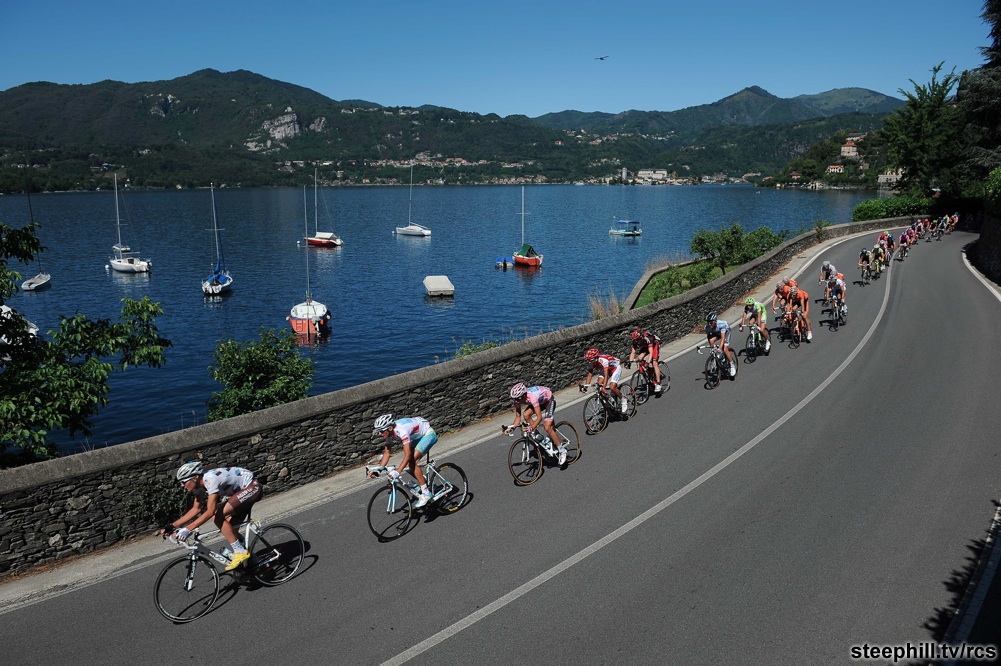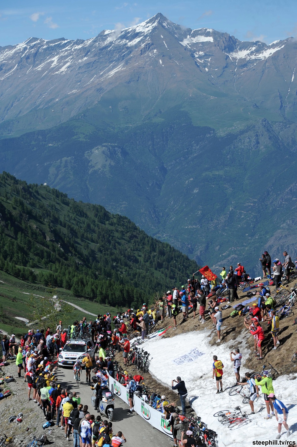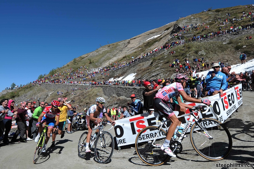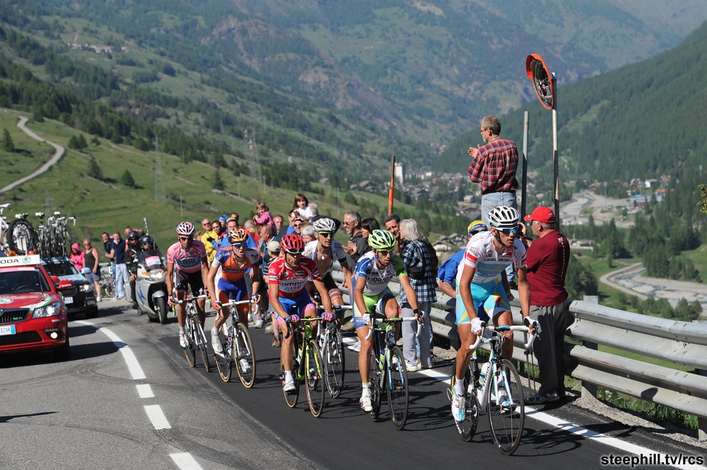 Đèo Sestriere (10 km dốc 5.1%). Vincenzo Nibali và Roman Kreuziger bắt kịp nhóm áo hồng sau khi đổ đèo Colle delle Finestre