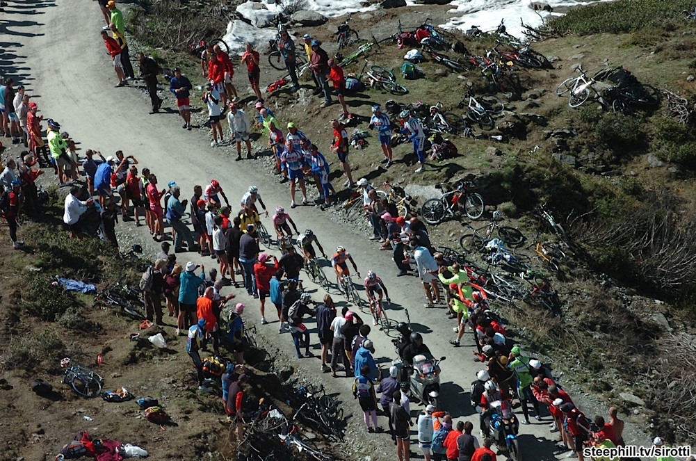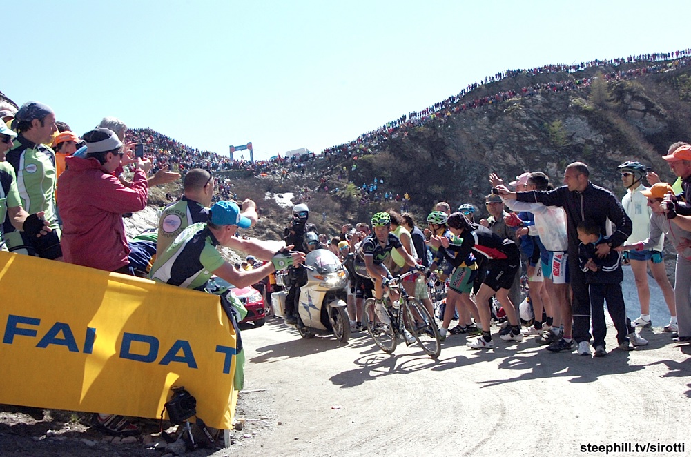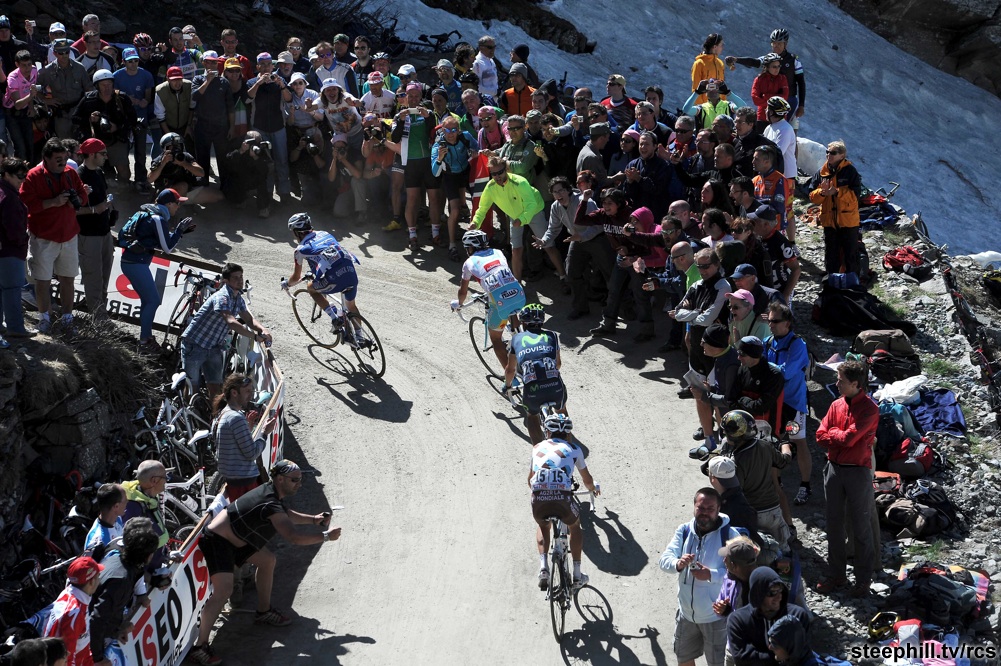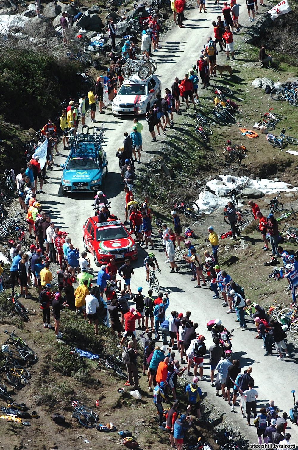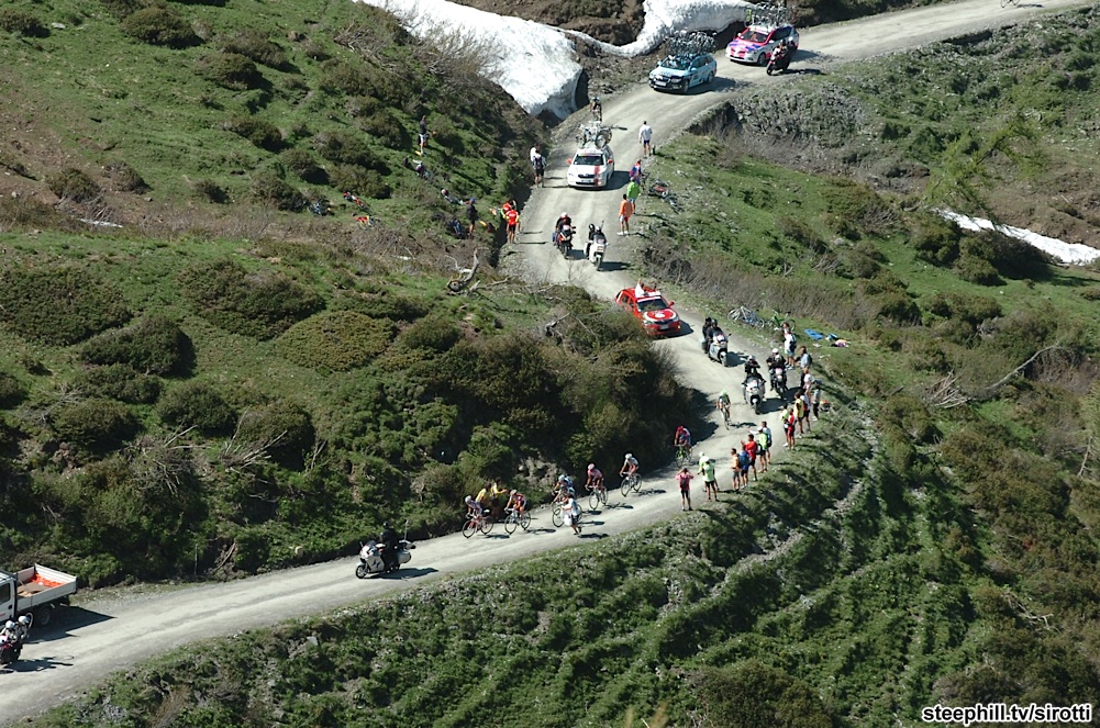 Vasili Kiryienka đang qua khúc cua ngặt cách đỉnh Colle delle Finestre 150m với 4 phút hơn peloton